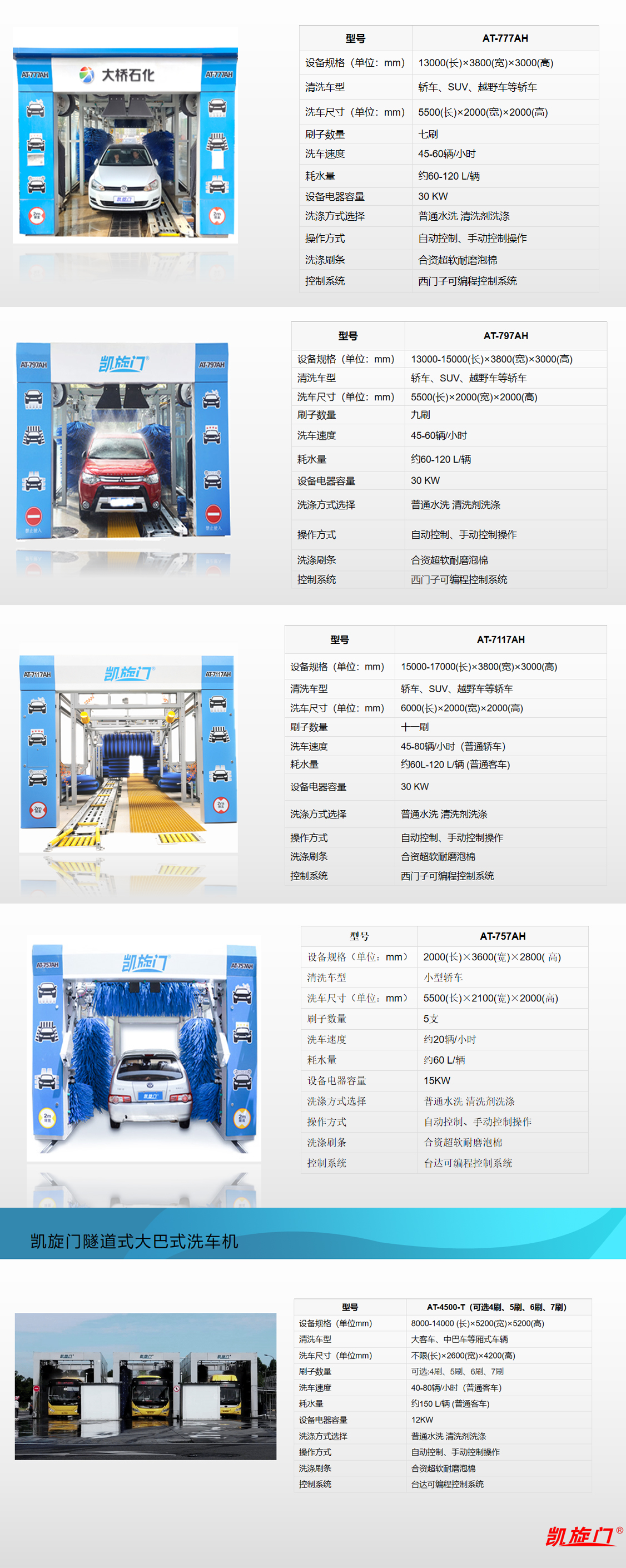 凱旋門(mén)AT-797AH隧道式洗車(chē)機九刷結構,帶吹干凱旋門(mén)隧道式洗車(chē)機,本款設備能快速洗車(chē),它的引進(jìn),大大的滿(mǎn)足了有較大營(yíng)業(yè)場(chǎng)地,洗車(chē)量大的客戶(hù)的需求,現在有許多日洗車(chē)量在200輛以上的客戶(hù),都在使用這款設備,本款設備堅固耐用,外觀(guān)兼顧國內外客戶(hù)的喜愛(ài),對場(chǎng)地適應能力強,各種性能出色。本電腦洗車(chē)機采用了人性化設計理念可適應最新型車(chē)輛要求,輸送機的人性化設計,不會(huì )有積水便于清理,入口有車(chē)輪導正器,方便車(chē)輛駛入;洗車(chē)機整機采用防腐框架耐腐蝕,外觀(guān)高端、大氣、上檔次,也是客戶(hù)選擇較多的一款洗車(chē)機設備。